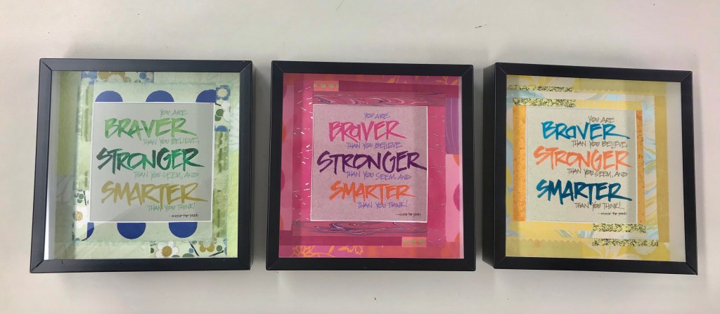 I am working on a project with two of my dearest friends, so I created a calligraphy piece using one of my favorite quotes from Winnie the Pooh. Each piece is in the favorite colors of each person. This way, when we are home we can be encouraged by words that uplift and help us embrace ourself and our friends.