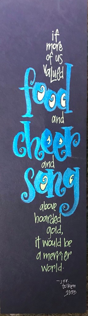 These words make me think of cheerful Hobbits enjoying a pint in their local pub. Food, cheer and song are theIr focus and nothing else seems to matter. The Shire provides what they need and they are content beyond their own expectations. Sure life can he challenging at times, yet their focus remains being grateful and joyous though life may be simple and at times hard.