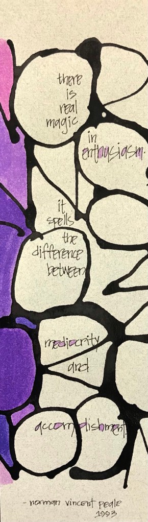This piece reminds me that enthusiasm isn’t always about the new, exciting, upcoming fun stuff on our plate. Sometimes enthusiasm provides a different perspective on old, gently worn out stuff as well. Enthusiasm allows us to see with fresh eyes that pile or project in the corner of our desk that we have been avoiding. Mustering a little courage allows us to revisit the original and revamp it into something for which we can see a new future. Maybe we put it aside because we didn’t see an end game. Maybe it was an assignment or project with a lower priority that has risen to the top. Or maybe we just didn’t like it, so we put it in the corner and hoped it would go away. And now it’s back, with the assistance of a little enthusiasm and bringing a renewed energy and idea to our world.