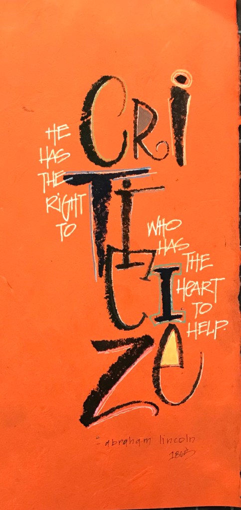 Next time someone presents a new idea, a piece of their work, or asks you for a suggestion, think twice. Is what you are about to say coming from a place of help and hope? Or are your motives less kind than that? We have the power to make the world a better place simply in how we approach commenting on the work of others. We get what we give, so let’s intentionally give help before we start down the lonely road of criticism.