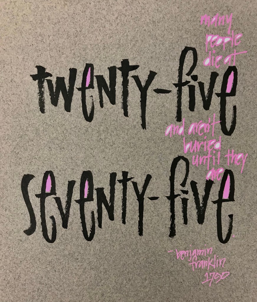 If you read my post from two days ago, you would remember that I am a big Benjamin Franklin fan. Here is another great reminder from good ole’ Ben about attitude and handling life. I must admit that the first age reference – twenty-five – puts me a little on guard, as I have nieces and nephews fast approaching that age. And to think they may already be giving up on adventures, challenges, building a life seems insane. That is when I reminded my self that people lived life much more quickly in Benjamin Franklin’s time, so by the time someone was twenty-five they were our version of middle age.