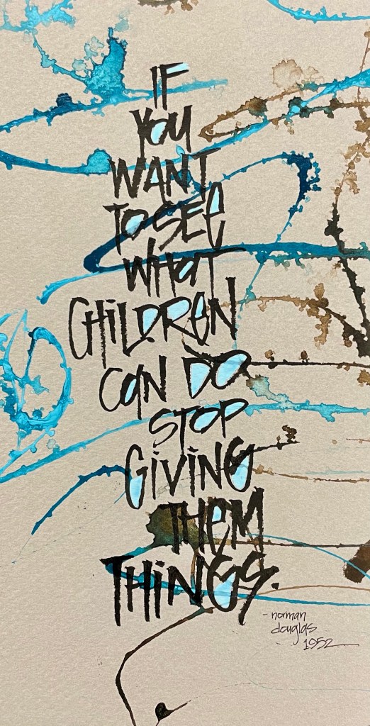 When I cam across this quote I remembered that story, and was again reminded that children to do not need every “thing”, they need a vivid imagination, challenges, and time to just be children. I had a more recent reminder of this message. A friend and her teenage daughter babysat our pets while we were out of town. The daughter brought her best friend, both of which are creatives. When I got home I was anxious to see how they “played” in my studio…nothing. Ya’ know what they did, they spent the weekend exploring our land with the dogs, walking, hiking, digging, just wandering. My friend then told me that she forget that suburban kids do not get much space to roam. So these two teenagers preferred being outside with no boundaries than playing in a fully stocked art studio. Go figure!