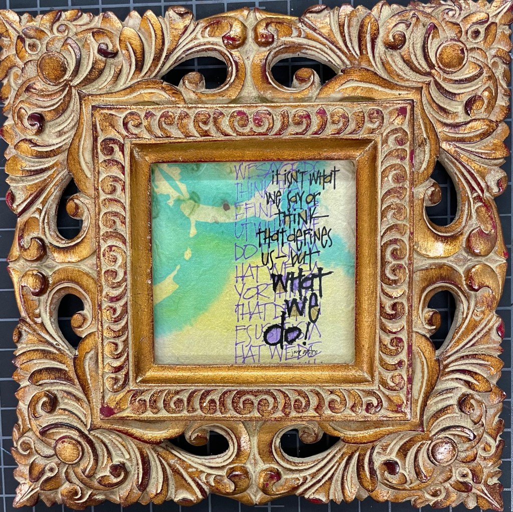 We are in the midst of several construction projects. Which means mess and mayhem and clutter. As part of this process I am creating specific pieces for us to read each day, this being one of them. I found the frame for $5 at an antique shop and the paper was a scrap from my table bin. I made several attempts to fit it all into the small opening and this is the one that finally worked. It is already hung up ready to remind us each day about what defines us.