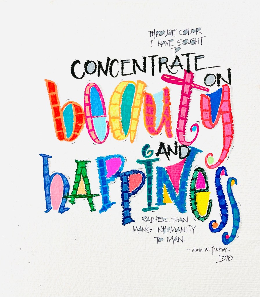 As I reviewed her body of work and thought about the barriers she must have battled, I wondered what she would have been like as a calligrapher. She enjoyed mosaic type strokes and composition, as well as whimsical topics. As I wrote out her words I gave my letters a little ‘Alma-ish’ flare and kept adding color. I had fun and I imagined she had fun when she worked, so for a few minutes we had fun together.