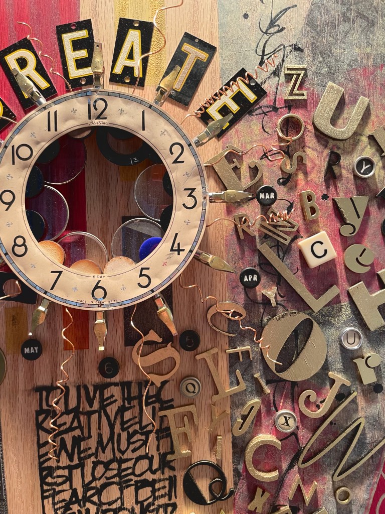 I created this piece and have it hanging in our foyer. A few weeks ago a couple bought a large table in our gallery, and they wanted to measure a chair to make sure the table was the right height. I took them into our game room to measure a chair and the woman saw this piece. She asked me if I would give lessons on how to do this type of work. Great idea! She and two friends are joining me next month to do just that, create found object mixed media art.