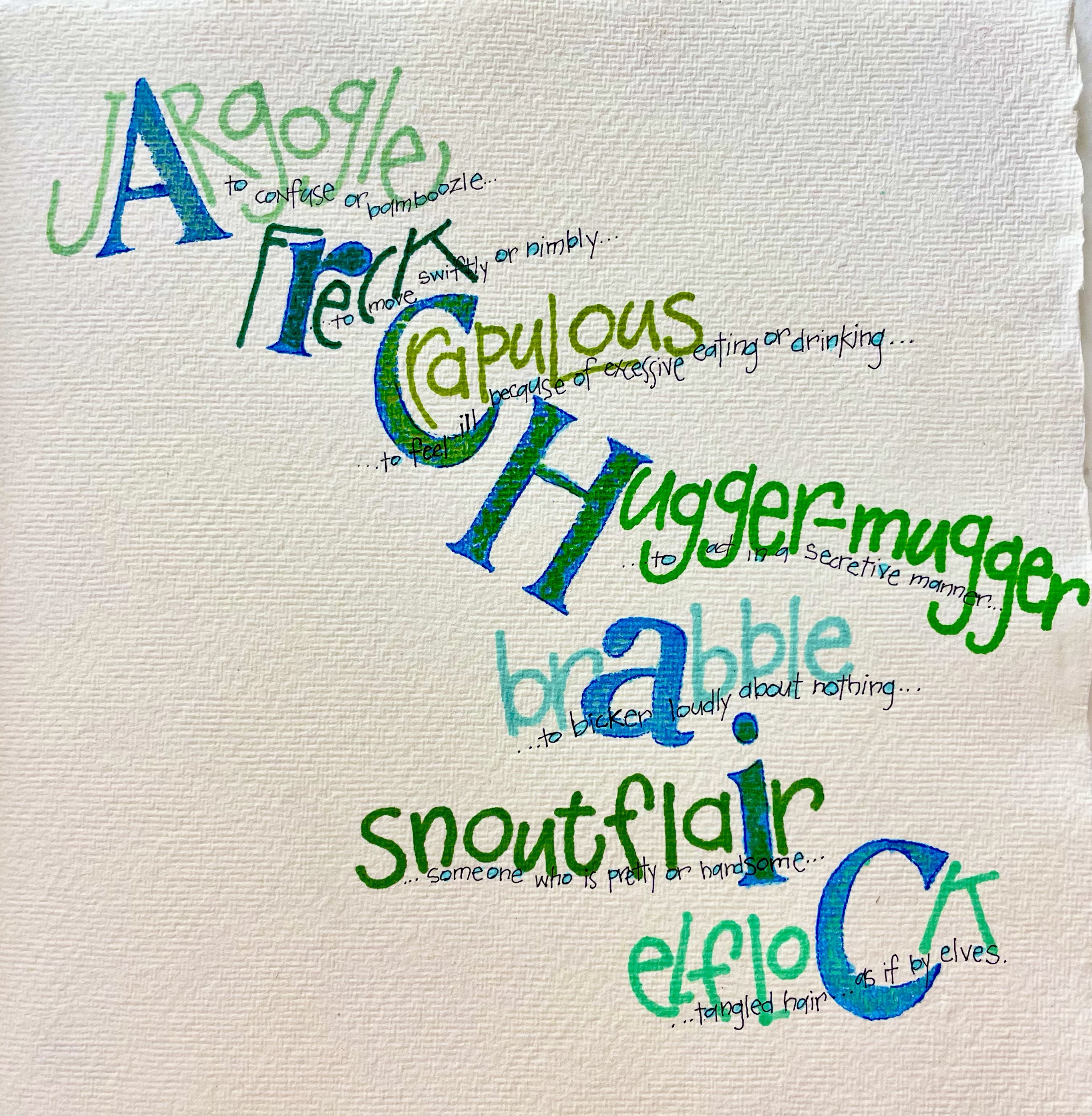 For week twenty-seven in our fifty week calligraphy challenge we were asked to look up archaic or obsolete words, letter them and include their definition. When I read the prompt I was busy cleaning up my studio, going through every cabinet and box to determine what would stay, go, or get moved to a better space. That clean up led me to an old stamp set my husband and I bought many years ago, and what a perfect tool to help illustrate archaic words. The large letters in each word are stamped, the others were written with Sharpie markers. I had no idea we had so many silly, old words out there with strange meanings and yet it was fun to imagine how and when they were used in conversation.