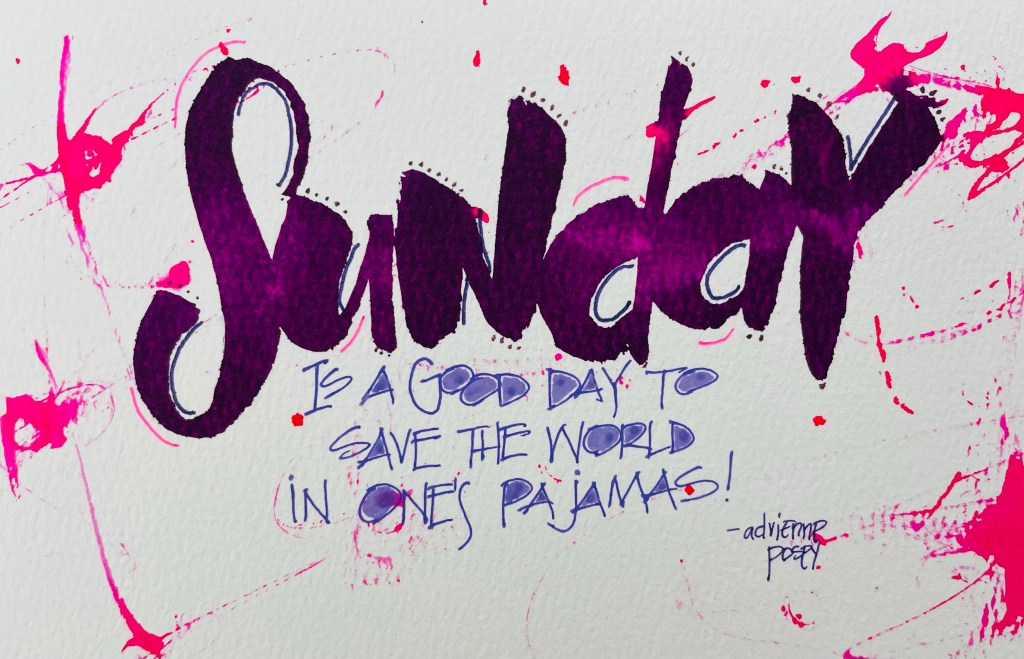 Wait a minute, today isn’t Sunday! Yet I still like this quote, and reading it on a non-Sunday day means we get time to plan to stay in our pajamas. I like staying in my PJs, in fact many of my pajamas have ink stains as I wear them too often into my studio. I also wear them to water the plants outside and sometimes to go get the mail. Yes, I am that neighbor although my neighbors cannot see me until I get to the mailbox. Hooray for living in the woods.