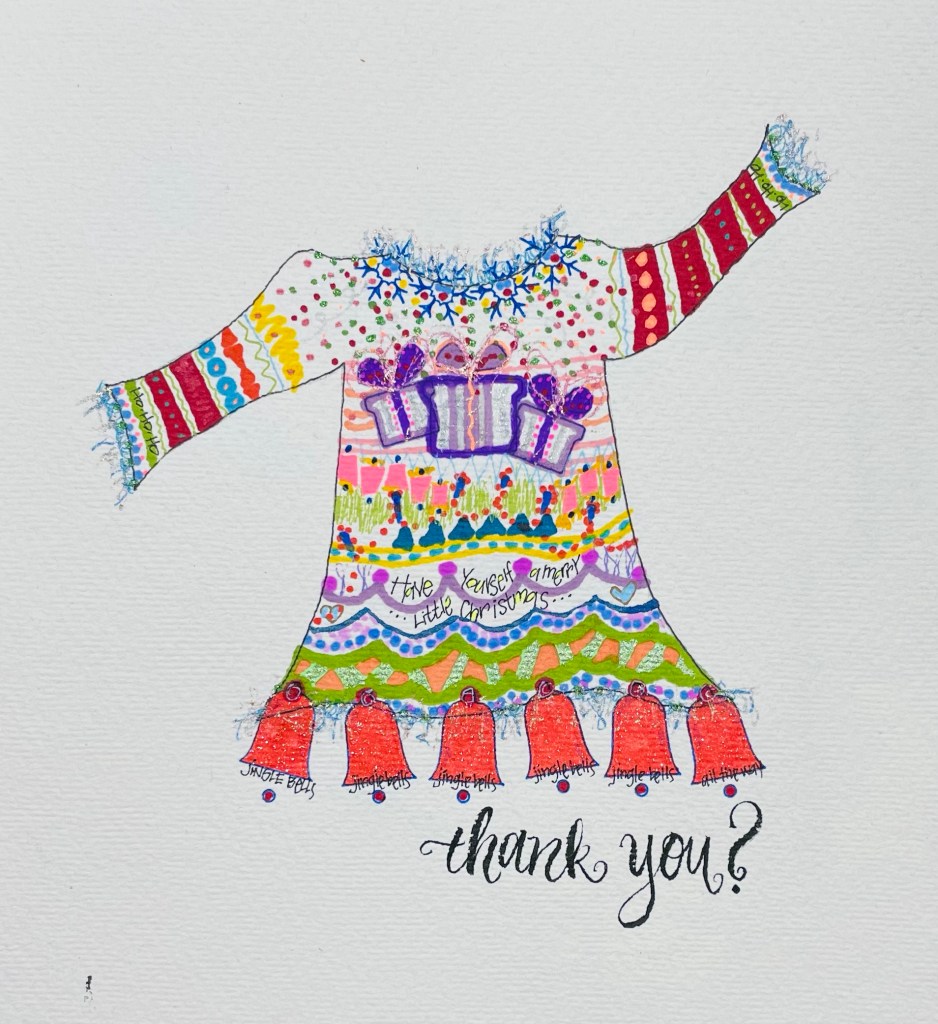 Christmas in July was our prompt for week twenty-nine in our fifty week Calligraphy challenge. All I could think of were those Ugly Sweaters people wear, and have become quite a trend for the holidays. I had fun drawing and playing with a variety of pens, inks and markers to get it just the right state of tacky! It reminded me of one I was given by a boyfriend’s Mother, which may have been the deciding factor for me to end that relationship.