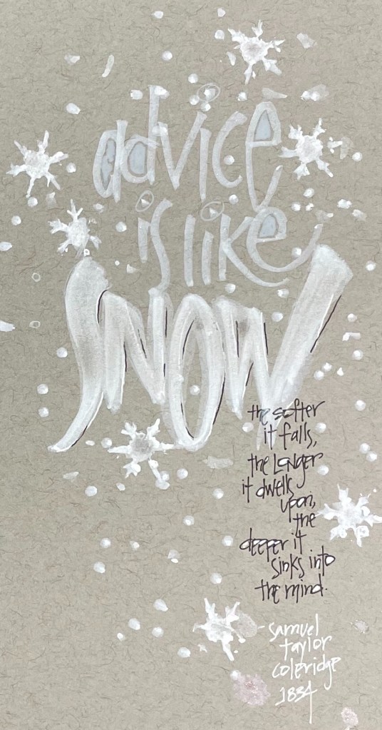 And like snow, advice doesn’t always last. What worked in this situation may not work in tomorrow’s. That’s when it’s good to be open, listen and ask those important questions. Advice has the power to bolster our confidence and makes us realize that when snow falls it falls on everyone, no one is immune from needIng a bit of good advice now and then. Take it and give it and then let it soak in and nourish what is already growing strong.