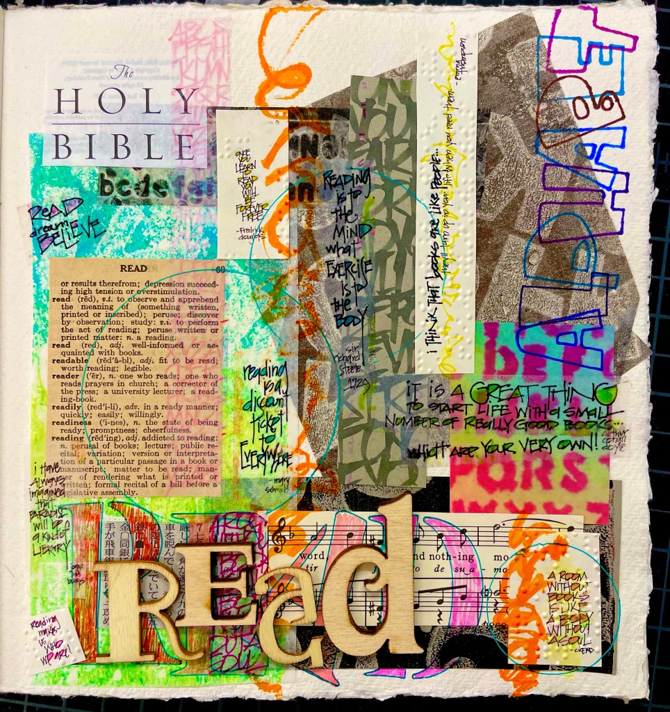 For week thirty-four in our fifty week challenge, we were given the prompt reading. Anything to do with the wonderful world of books or reading. No other parameters. I had a hard time landing on just one quote, so I decided to great a collage of all the things about reading that I love. I utilized bible pages, dictionary snippets, Braille, paper scraps, newspaper, wooden letters, see through tape and every type of pen or marker in my studio. Everyone from Arthur Conan Doyle to Fredrick Douglas are included. It was a fun afternoon’s work and I think it turned out pretty well. It may need something else – believe it or not – just not sure what that would be.