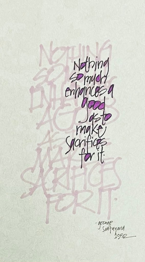 What are you sacrificing for? What project, thing, vacation, promotion or other item on your desire list has not gotten done, gotten here or gotten accomplished yet? Hold on, keep hoping, keep working, it will arrive. And when it does all those sacrifices will make the gain that much better. These words from George Santayana are so very true, nothing enhances the good as much as sacrifice. It may be hard, you may get discouraged or wonder if the good thing will ever get here, just keep believing. Keep working and putting things in order. It will arrive, and when it does it will be REALLY good!