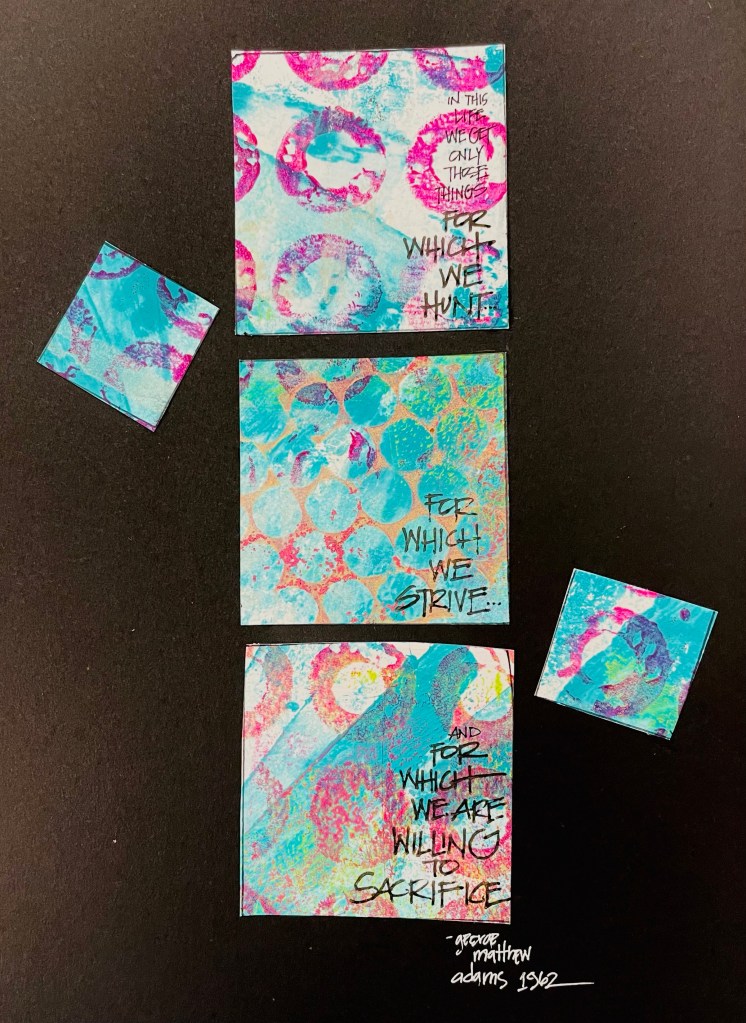 As part of the creative process there are always leftovers, scrap pages and remnants from projects. They sit in piles or bins and wait to be released into the wild that is a piece of art. These scraps were created when I cleaned my rollers and stamps during gel print projects. I have a cheap notebook I use to clear the inks by stamping, scraping or pulling the ink from the tool onto the pages. It looks messy, until you zoom in a little closer and can “see” the hidden gems of color combinations. My friend Laurel taught me to never throw away those pages, they hold future gold! And she was right!!!