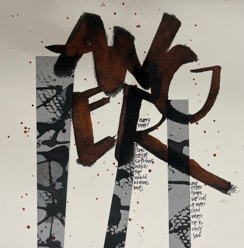 This was one of the first pieces I created for my 5 Stages of Grief journal. I actually did it for a friend who was struggling with a death in her own life. Her husband was distant after hearing about his best friend dying instantly from a heart attack. Sometimes we need other people’s words to help us understand. Here is what the tiny text says: