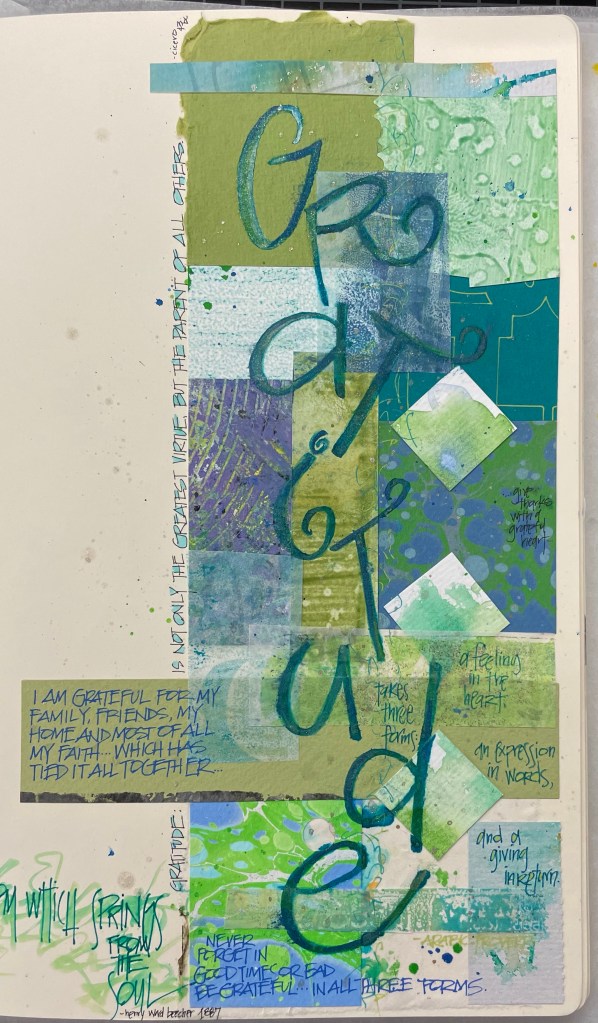 This is yet another page from my 5 Stages of Grief Journal. I wanted to acknowledge all the things I am grateful for during this time of mourning. I am slowly building the page by filling it with words and phrases, lyrics and poverty about being grateful. I found this Arabic Quote that reads as follows: