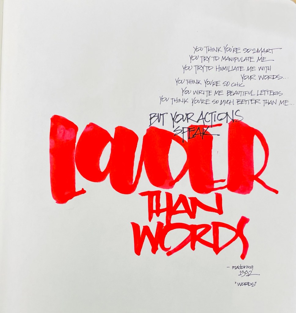 Madonna could have focused her songs around other more popular topics. Instead she chose to use her talent and skills to remind us that actions speak, so act wisely. All of us need to be mindful that what we say and how we behave need to be in unison if we want our message to be clear. If they are not united, then our actions will always win out in delivering the strongest message.