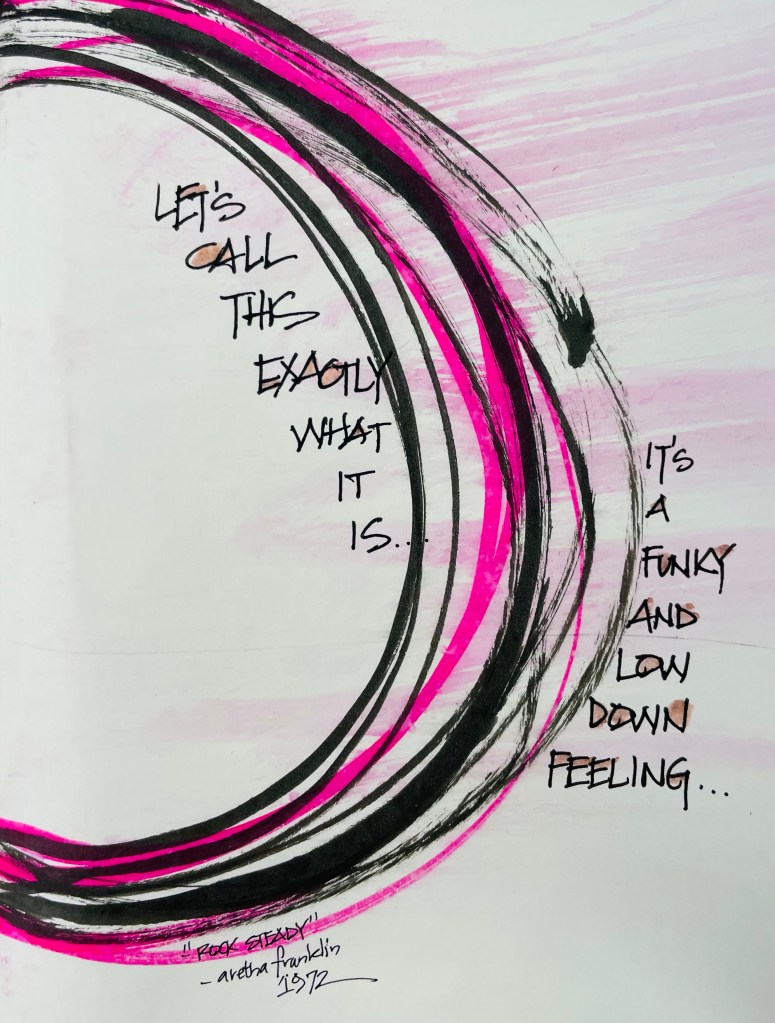 I was stumped today as to which female songwriter to feature. I was blowing leaves – a regular occurrence this time of year – and I told myself to think! Which then made me start humming the iconic Aretha Franklin song of that same title – Think! I featured that song last Inktober, so I did some research on other songs written by Aretha…Rock Steady came to mind. She wrote it in 1972 to change her brand, change her style, change the way her career was going…and it worked! She was intentional about making things different for her moving forward. She got a new band, all white guys, changed her location and changed her style.