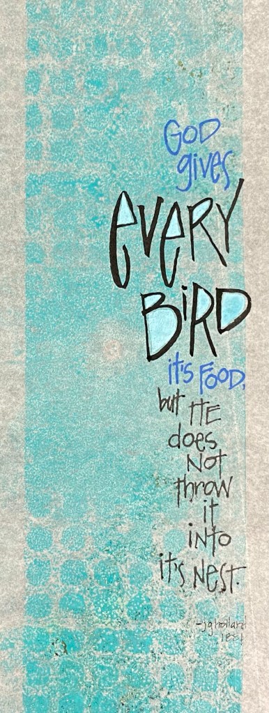 When I read this quote I liked the reminder that God provides, and also expects us to be part of the equation not just sit in our nest and wait for the food to be thrown our way. Hard work is not always a sexy concept. It isn’t popular on Facebook or Instagram, and you rarely if ever see a post about how much people sweat doing boring, daily, life maintaining chores. And yet we all have to get out of our nest and do the work. In order for things to happen in our lives, we have to do the maintenance that our life requires. Cleaning, paying bills, earning the money to pay those bills, and personal care items that make sure we are taking care of ourselves. Not especially exiting things, just things that have to happen in order for our lives to continue.