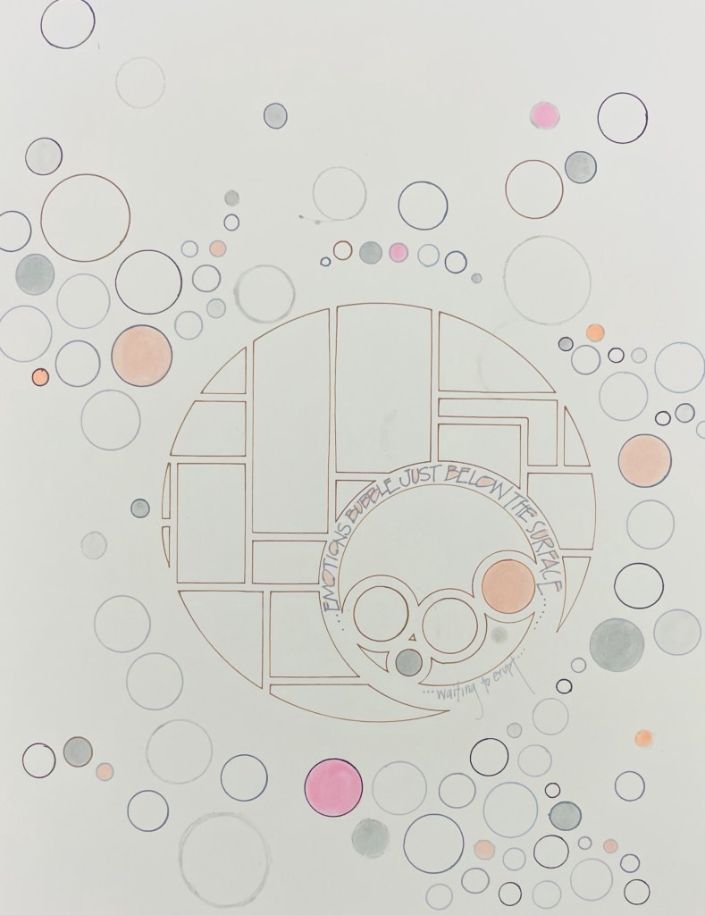 In this page from my 5 Stages of Grief journal I wanted to illustrate that emotions are like bubbles. They linger around, rise up, some pop, some keep going and yet they always feel like they are lurking just below the surface waiting to explode. I had a friend see this piece and she said, “YES!” That is exactly how it has felt. She has experienced multiple deaths in her family within one year, a lot to handle and a lot of emotions to bubble up.