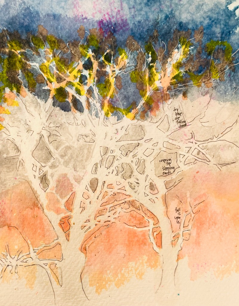 It is week forty-four in our fifty week challenge, and the prompt was Haiku. Writer our own, use a famous one, or do something else involving a haiku. I had to remind myself what a haiku was – five syllables on the first line, seven syllables on the second line, five syllables again on the third line. I had blown leaves as I do each day this time of year, and was struck by the sunset behind our trees. I used watercolor to try and mimic the lighting…not a great version, but you get the idea. I wrote the following haiku: