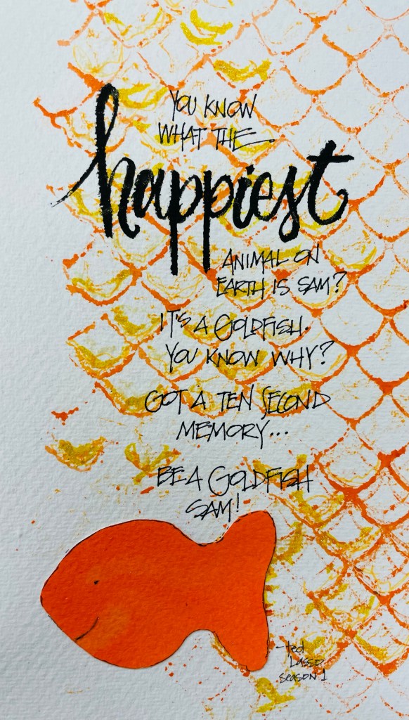 For week forty-five in our fifty week calligraphy challenge the prompt was Ted Lasso. Holy cow how I love this show! We were given famous lines from season one and two and asked to choose one to letter. I could not help but do this one…let me explain.