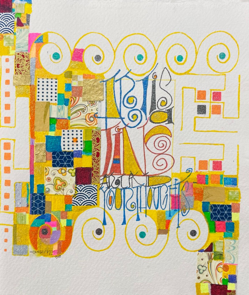 For week forty-six in our fifty week calligraphy challenge, the prompt was Art Noveau. I had to google this topic to gain a bit more reference, guess who I picked? Gustav Klimt. These are his words and if he had been a calligrapher I don’t think he would have liked straight lines or symmetrical lettering. I enjoyed working with random colors, and I gained a new appreciation for his work ethic. I used inks to get all the gold, he used gold leaf and that’s a lot of work. the days it must have taken him to fill a canvas are mind blowing!
