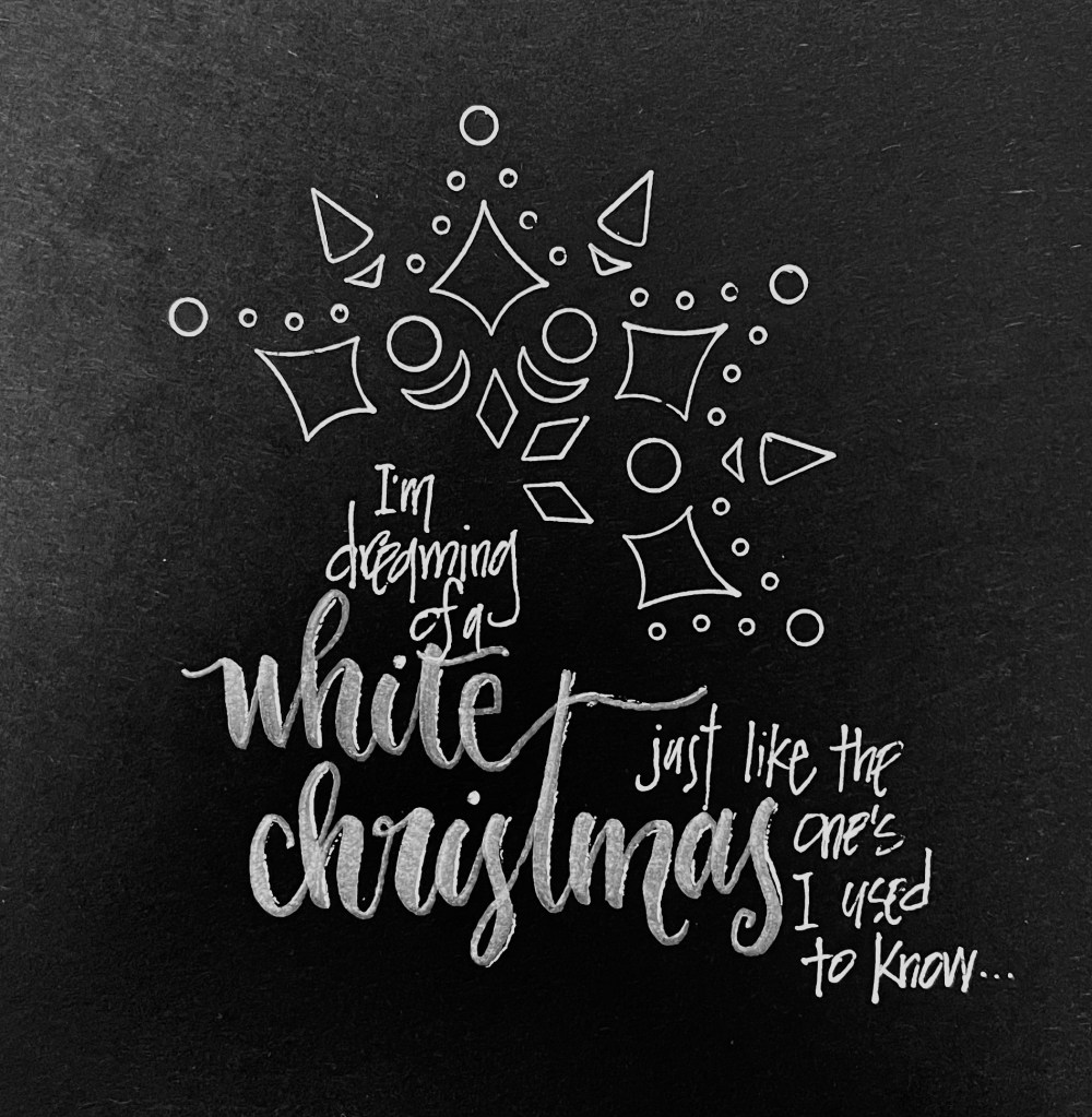 For week forty-nine in our fifty week calligraphy challenge, our prompt was December. Anything to do with that month. I tried six other ideas before I landed on the thing I wish we had, snow. Not a torrential dumping just a light dusting, just to see it. It is the one thing I miss about living in the South, snow this time of year.