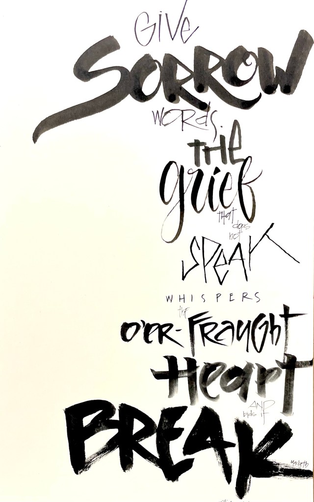 I have never read Shakespeare, so when I found this quote I knew I wanted to use it in my 5 Stages of Grief journal. I utilized fifteen different brush pens, or various inks and sizes. The first line is what caught my eye – give sorrow words. If we keep our emotions, grief or any other, bottled up inside us we eventually break. Our emotions are there to help us deal with things in our lives, they are the final element in understanding what is actually happening. When we ignore them they build up and break like a dam.