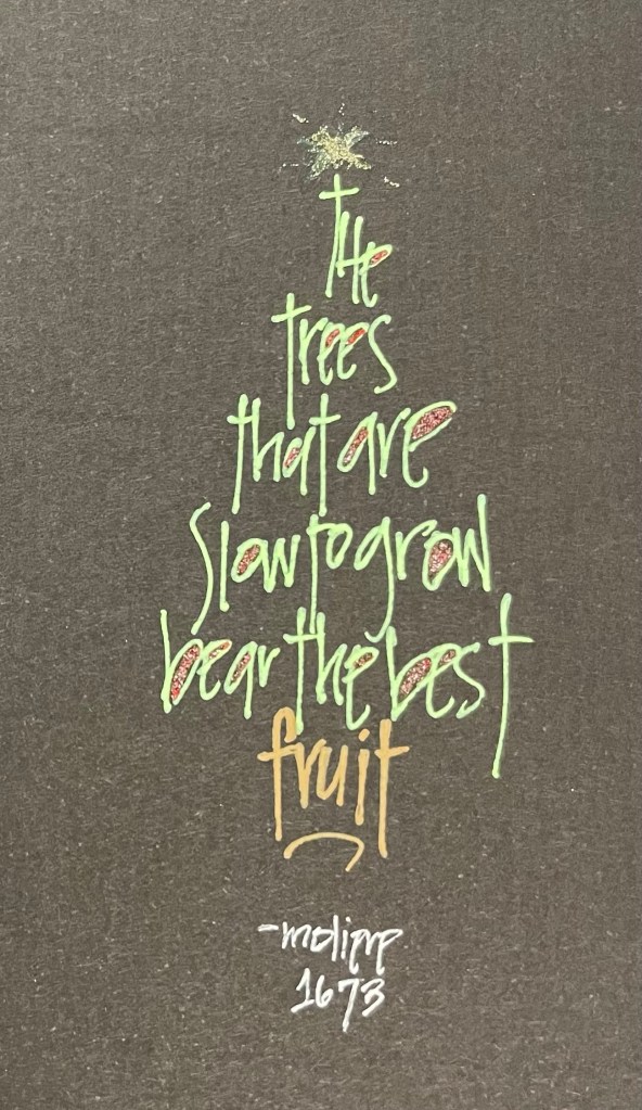 The true spelling of lucky is W – O – R – K! Hard work is what truly gets things done, no matter how frazzled or tired or frantic the day may feel. Those who put in the effort, for a long period of time, consistently, and no matter what anyone else does, those are the people who bear fruit. Just like this phrase reminds us, it is the slow growing trees that bear the best fruit. We are not a culture that rewards slow growing, we want it now!