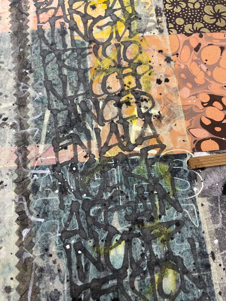 I am down to the last ten pages or so in the 5 Stages of Grief journal. It has been four months since my father passed away, and this journal has been the place where I am expressing our grief through paper, ink and collage. This is the beginning of the cover. It is paper scraps covered with rice paper glued over it. The rice paper becomes transparent when it gets wet, so it allows the elements underneath to peek through to add dimension. When the journal is complete my husband is going to make a sleeve for it, to store it upright in our library.