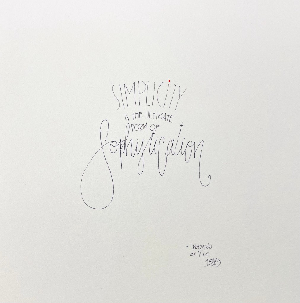 It is week three in our year long calligraphy challenge and the prompt was pointed pen & simplicity. Pointed pen is a very fine tipped tool usually utilized for ornate, sophisticated lettering like envelopes or wedding invitations. I did not have that tool available, so instead of over complicating things and waiting to find one, I went with a simple ink pen. I think the best part is the little red dot, just one, one simple dot.