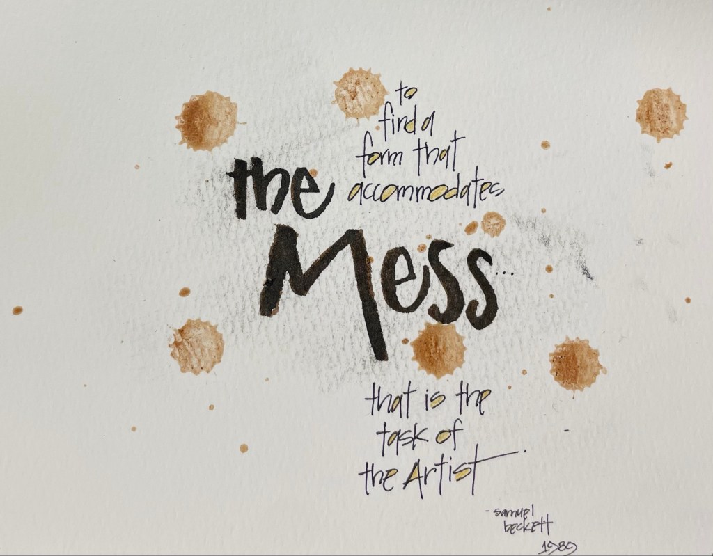 I have a pile of papers that have marks, smears, even mistakes on them. I put them aside to let my brain marinate over using them again in the future. When I saw the piece of paper with hot chocolate stains (I added a few out of anger after I mistakenly made that first splatter) I had an idea. I found this quote and loved the idea of taking a mess and making it into something else. It was more than four months after I had made the initial spill, so my thoughts had time to gather themselves and settle into using this messy page. The right words helped me pull it all together.