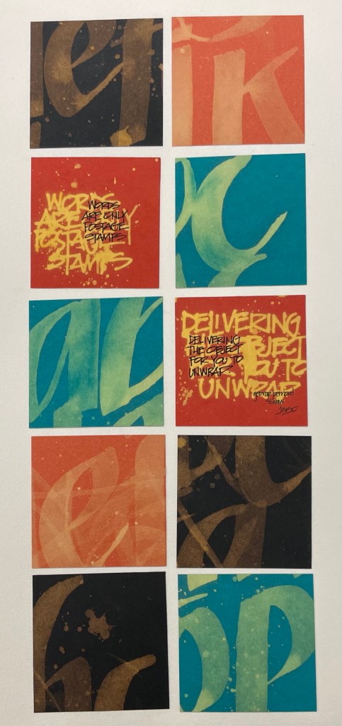 I had to be patient as it can take time for the bleach to do it’s thing and dry. As I splattered to get multiple layers of bleach I was very aware that splatters might also hit things in my studio other than the intended paper, so I washed my hands and surfaces frequently. I then cut each page into two inch squares, finally adding the minute letters for the quote. This challenge was like having science, housekeeping and calligraphy join forces to create something mystical!
