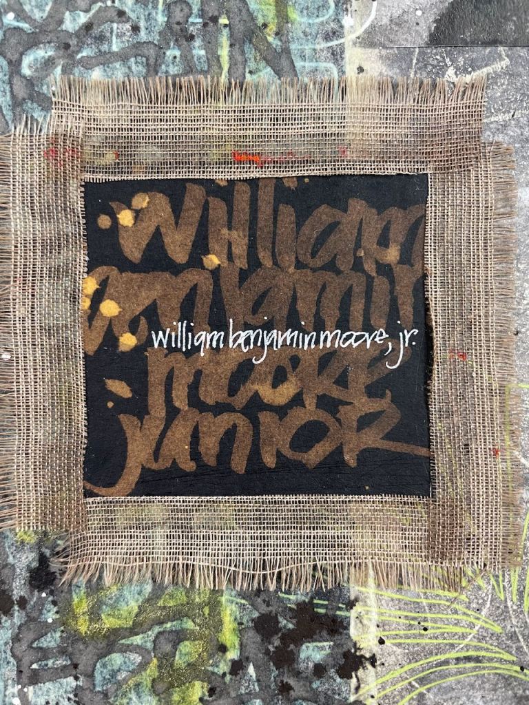 As you’ve been reading this blog for a while, you will be familiar with the 5 Stages of Grief Journal I have been working on for the last six months. I added this ‘label’ to the cover which includes my father’s name in both ink and bleach. It helps identify the front of the journal. The edges are actually a recycled piece of ribbon that previously hung off a Japanese door bell we have on our back deck. As the ribbon had degraded it was a perfect addition to the total label.