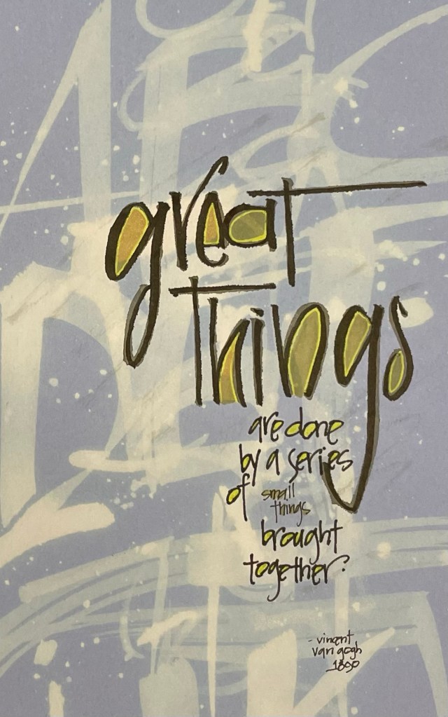 My brother has begun training for his 50th marathon. His goal was to run a marathon in each state, his last one will be in Hawaii. When I read this quote from Van Gogh it made me think of all the steps my brother has run in order to reach his goal. The travel, the training, the long hours of running in order to fulfill his goal. Each day it was small things that made it possible for him to do such a great thing.