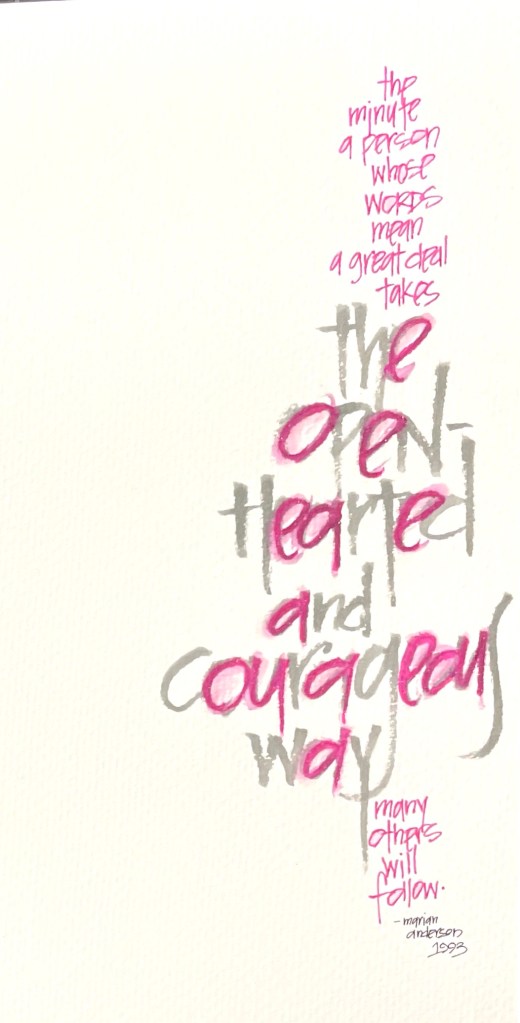 She was an African American Opera singer who was not allowed to sing at a DAR (Daughters of the American Revolution) event because of her color. Eleanor Roosevelt was so insulted by this decision that she cancelled her own membership in the DAR, then scheduled Marian to sing at an event at a national monument. These words from Marian help us understand the power we have when we exercise our own courage. FYI, Marian later sang at the Lincoln Memorial during Martin Luther King’s walk of freedom and became the voice for the Civil Rights Movement. No one ever prevented her from signing again because of her color.