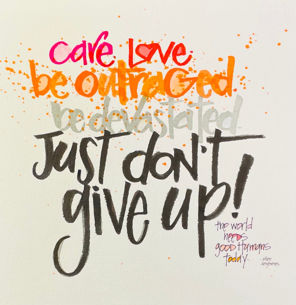 Lots of things are going to happen to you today. No matter what happens, take these words from Ellen Degeneres to heart. Care. Love. Be outraged. Be devastated…just don’t give up! It is not unusual to feel all ends of the spectrum of emotion in one day, so let it happen and don’t give up. Don’t let the ups and downs prevent you from doing the thing you are working hard to do.