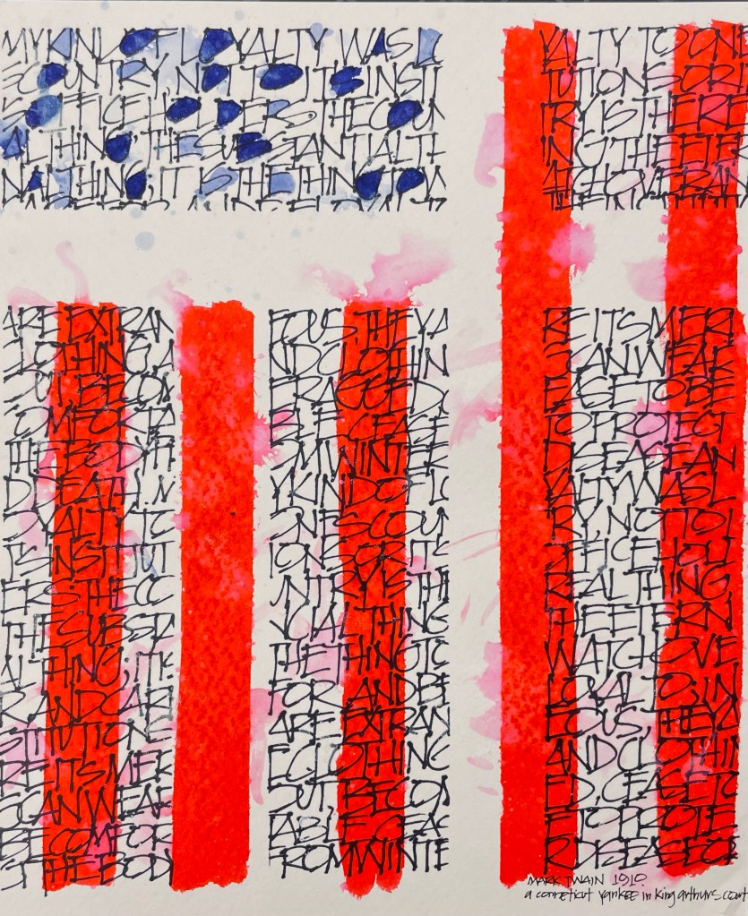For week twenty-two in our fifty week calligraphy challenge, we were given the name of Mark Twain. Any of his words were what we needed to utilize. I enjoy how Twain could bring home a point with humor and common sense while making us think through our laughter. This quote is from A Connecticut Yankee in King Arthurs’ Court. I thought it correlated perfectly with where we are right now as a nation and a people who call themselves Americans. I wanted to do something patriotic and yet something graphic to make people think. I wanted the piece to look like an American flag without making it too perfect. The drip and dribbles were all intentional.