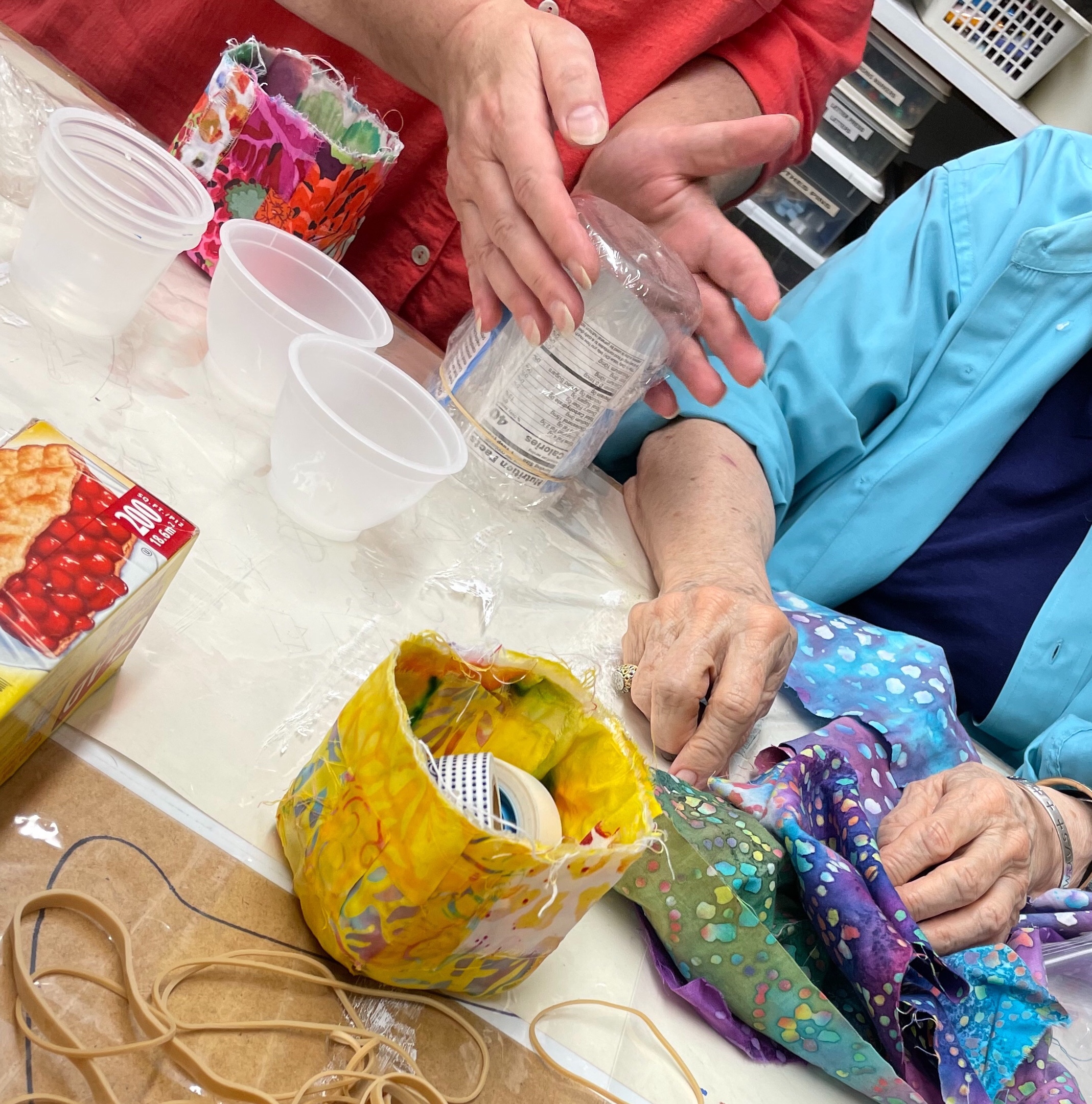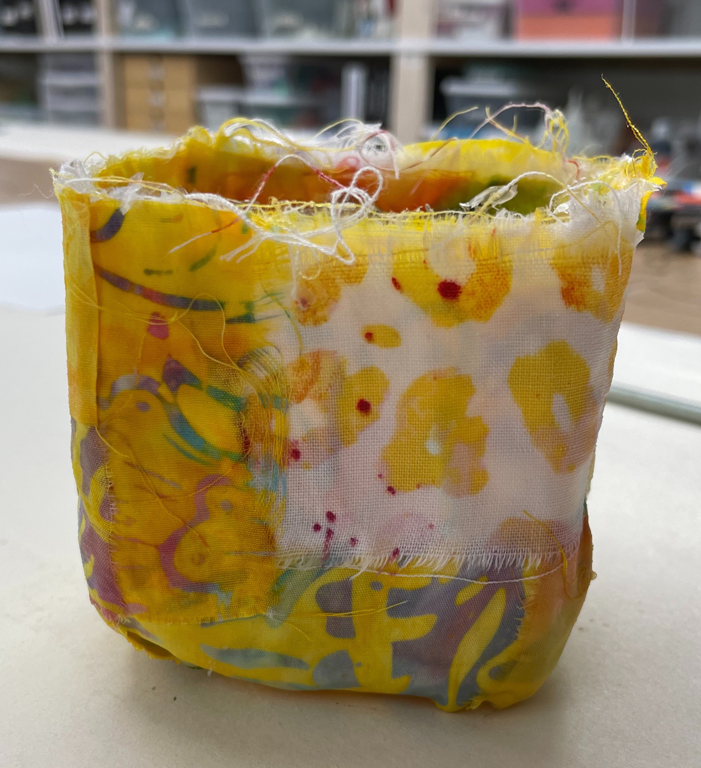 This past weekend we spent Saturday with our talented friend Laurel Englehardt. She taught us how to make fabric vessels from fabric scraps, glue, and plastic wrap. We spent the day gluing and creating. It was fantastic! She made the yellow one as a birthday gift for me, then we later created more ourselves. Who knew that glue and fabric could look so good?