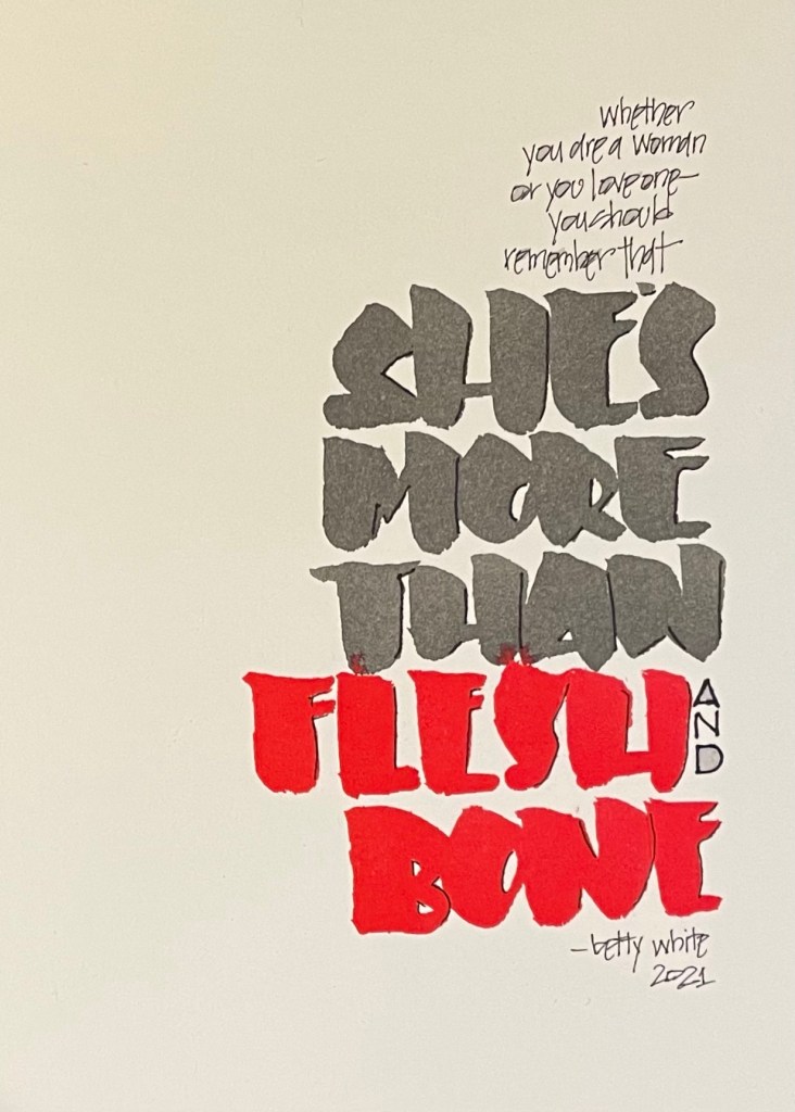 Betty White died at the age of 99…she REALLY wanted to hit three digits. She was seventeen days shy of hitting her goal when she passed away after having had a stroke. In her over sixty years in television she said a lot of wonderful things. I appreciate this quote as it is an encouragement to all of us – men and women alike – to celebrate and appreciate women. “She’s more than flesh and bone”, she reminds us. I think we need to remind ourselves of that as well.