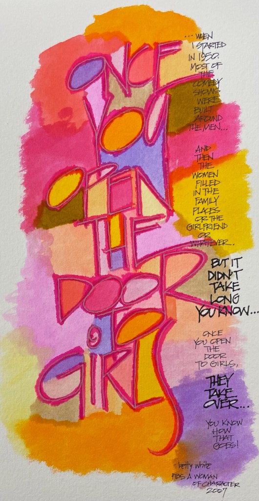 She was on television for nearly seventy years. Betty White started her career when women were part of the scenery, not part of the plot. As she notes here, “once you open the door to girls they take over – you know how that goes!” She was there when it all began to change. She credits Carol Burnett for helping light the way for other women…including herself.