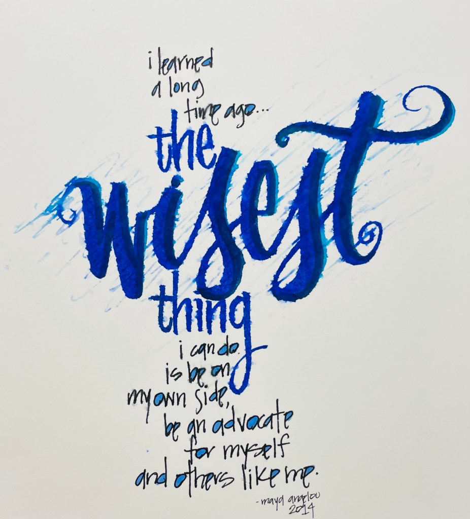 Once we exhibit the courage and freedom to be our own best champion, THAT is when we have won the right to do the same for others. Maya gives us the second step…“be an advocate for myself and others like me.” There is great wisdom in following someone who leads by example. Not that they are perfect all the time, yet somehow they have figured out how to do it for themselves. Once they can do that, it gives them credibility in doing the same for others. We strengthen our own resolve and beliefs when we have won a few battles, then can apply that strategy to supporting the bigger picture.