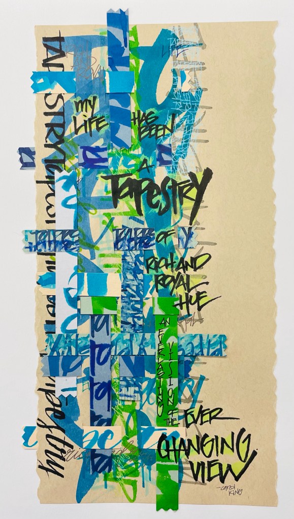 For week three in Scribbled Lives we were given Warp & Weft as directions. These are weaving terms describing the horizontal and vertical threads in a piece of fabric. Which in terms of calligraphy meant were were to write letters vertically and horizontally. HHHmmmm…. interesting challenge. I thought of the word tapestry and remembered Carol King’s Tapestry album, and found these lyrics: