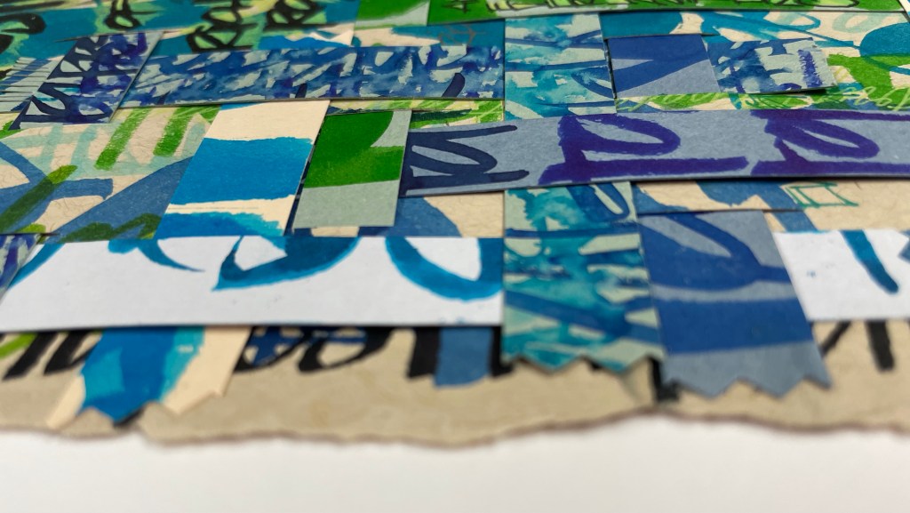 I wrote the word tapestry on six different types of paper, using multiple shades of blue and green, and then created a larger background. I cut the individual words into strips then “wove” them into the larger background. Here is a side view of the piece: