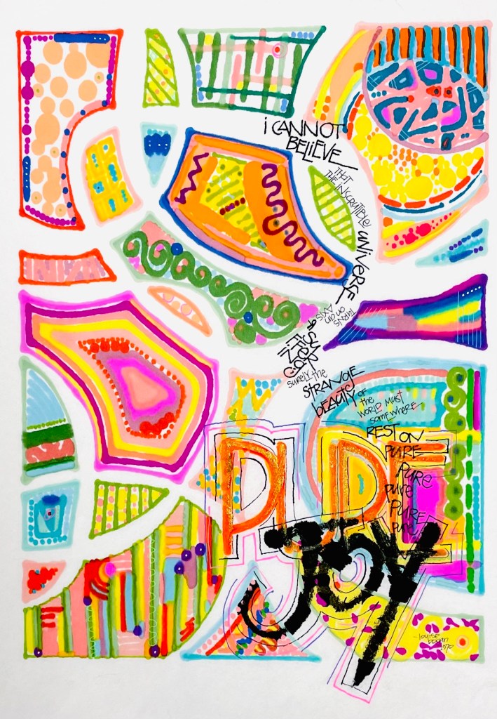 I had time to kill and thoughts to keep positive, so I opened my stash of Sharpie markers and got busy. I love when ink bleeds so I began by choosing rice paper, which is delicate. I knew the markers would bleed and do things I did not expect. I needed the joy those little surprises would bring while I worked. I utilized a large stencil for the shapes, randomly drawing and filling it with colorful marks. I spent about three hours doodling and watching those specks of color mingle on the page. Once the shapes were filled, I removed the stencil and wrote the text in black. I used Sumi ink and a large brush for the word Joy. I had my world that must rest on pure joy. The vet’s office called later that afternoon, and surgery went fine. Biscuit is now healing and another adventure begins as we work through her recovery period of six weeks! Six weeks of an energetic lab that must be contained and still…oh boy!
