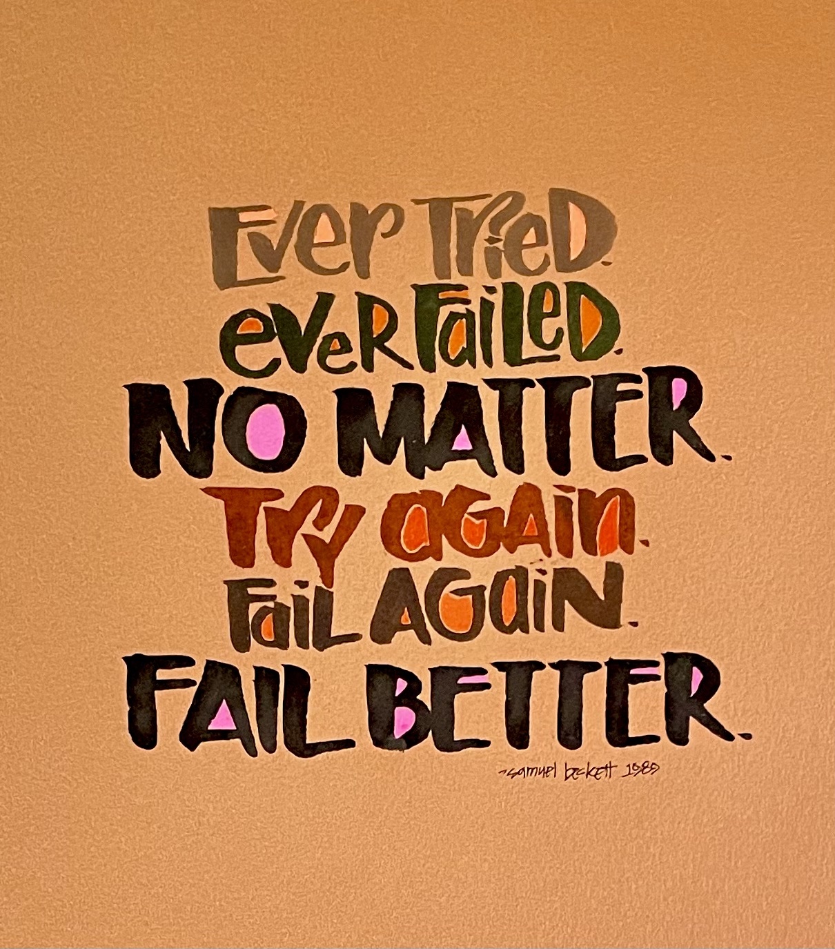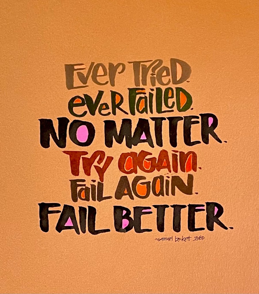 Maybe the reason we give up is because we have conditioned ourselves to dislike failure. We take it personally and somehow chalk it up as personal attribute, instead seeing it is a byproduct of being successful. And if we listen to Thomas Edison and Samuel Beckett, we need to embrace failure AND feel good when it happens. (That’s a tall order!) By making mistakes, failure and fumbles part of the process, we can leap past them to the good stuff, the successful moments, the times when it eventually goes right. No one is perfect…no one. No one gets it all right the first time, the second time or even the third time.