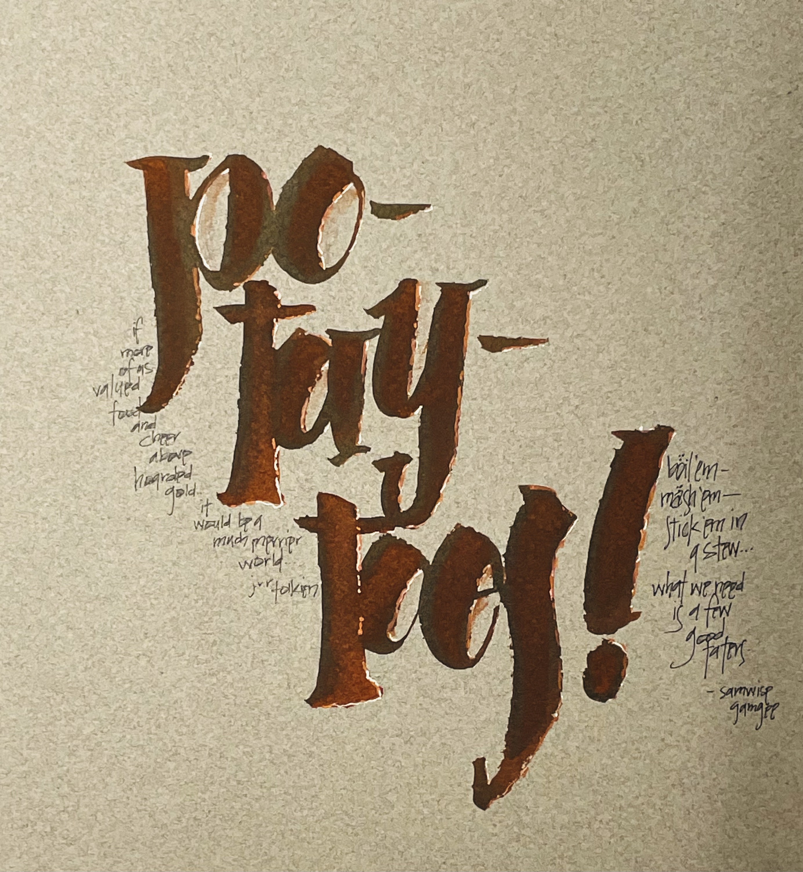 For week nine in Scribbled Lives, we were prompted with JRR Tolkien. Anything to do with his writing was open fodder. My husband and I recently binged The Lord of the Rings movies, and my husband is a foodie. So these words from Samwise Gangee rang rather true to form.