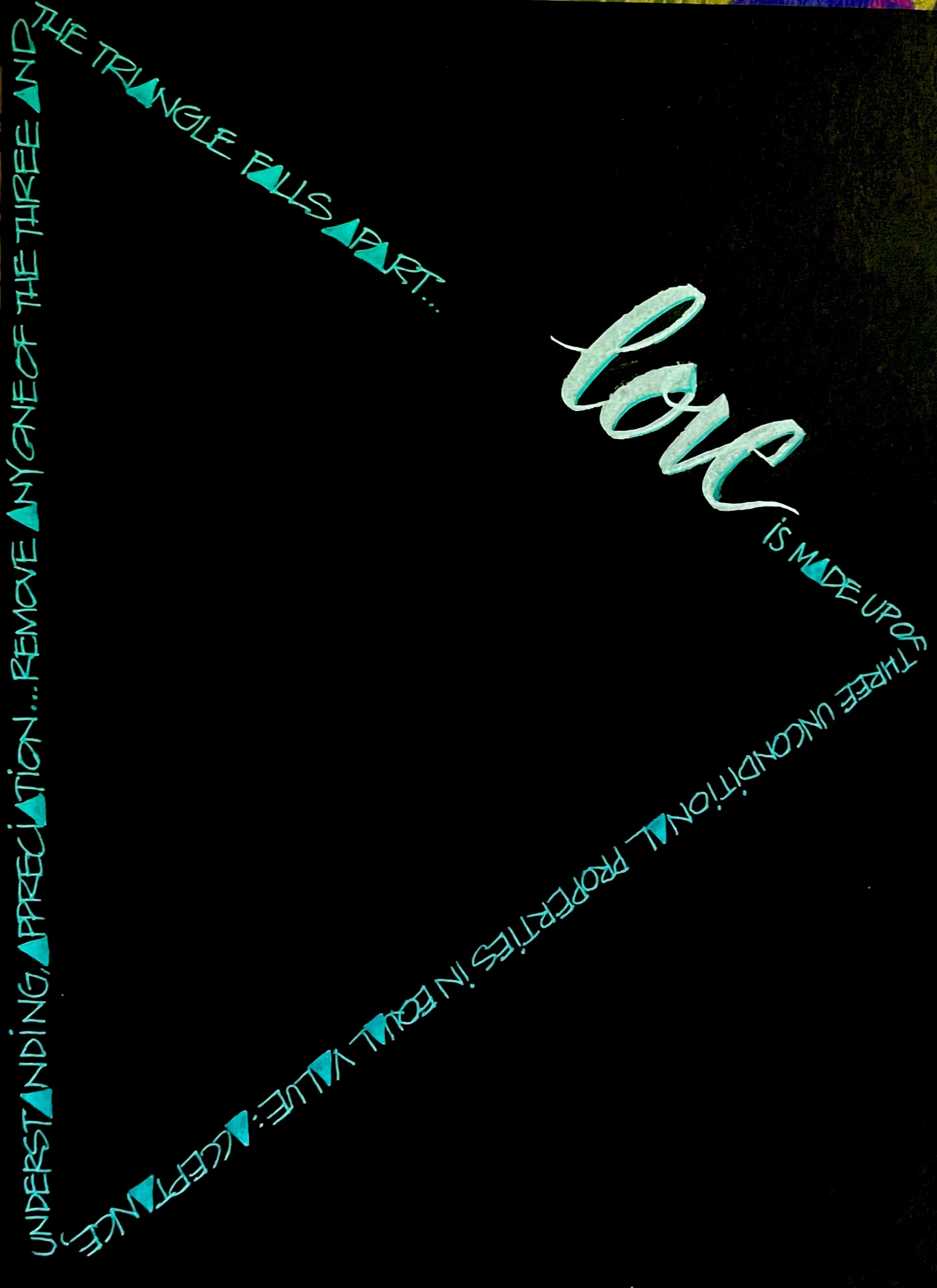 Love is made up of three unconditional properties in equal measure: Acceptance, Understanding, Appreciation. Remove any one of the three and the triangle falls apart.