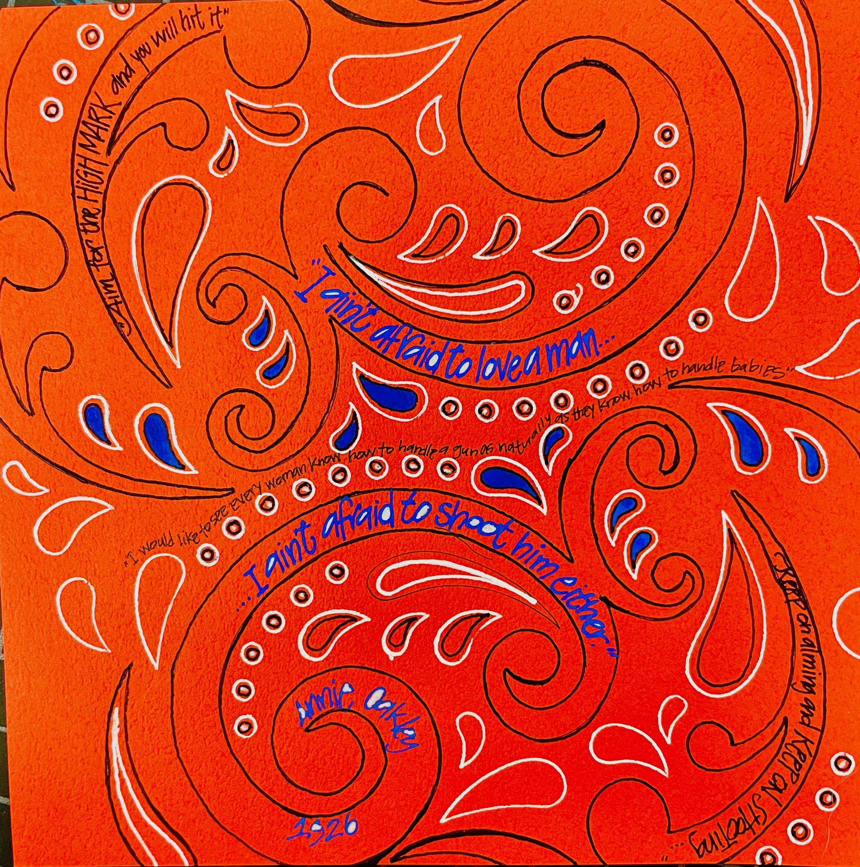 The artist has a great many pieces that include women wearing red bandanas. I was inspired to create a mock bandana with words from a real life Cow Girl, Annie Oakley. She said: