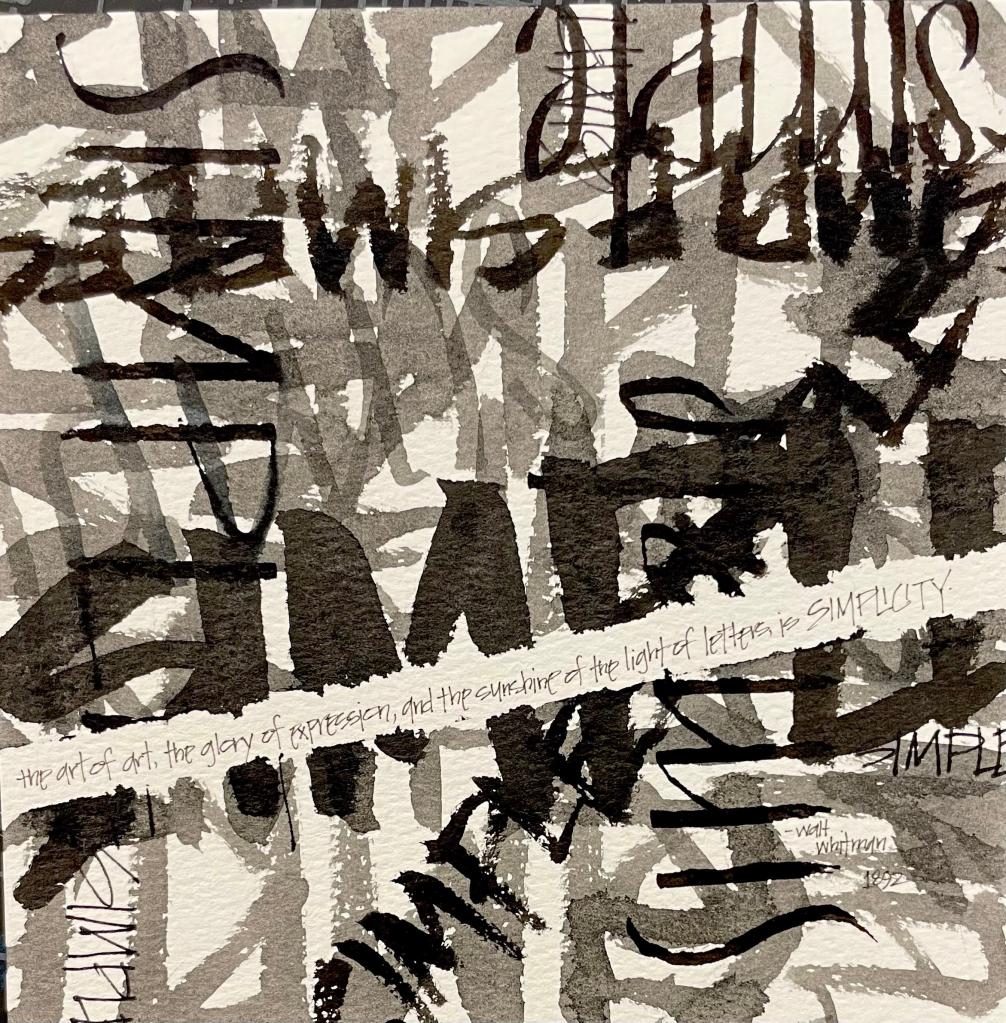 For week twenty-three in Scribbled Lives we were given parameters. Black ink on white paper, something that represents the word simple. I struggled as I saw everyone else’s work, because I had those exact same ideas. I wanted to emphasize that simple can get overwhelming by writing the word simple over and over and over again, until it made a mess. I found these words from Walt Whitman which perfectly state the beauty of simplicity: