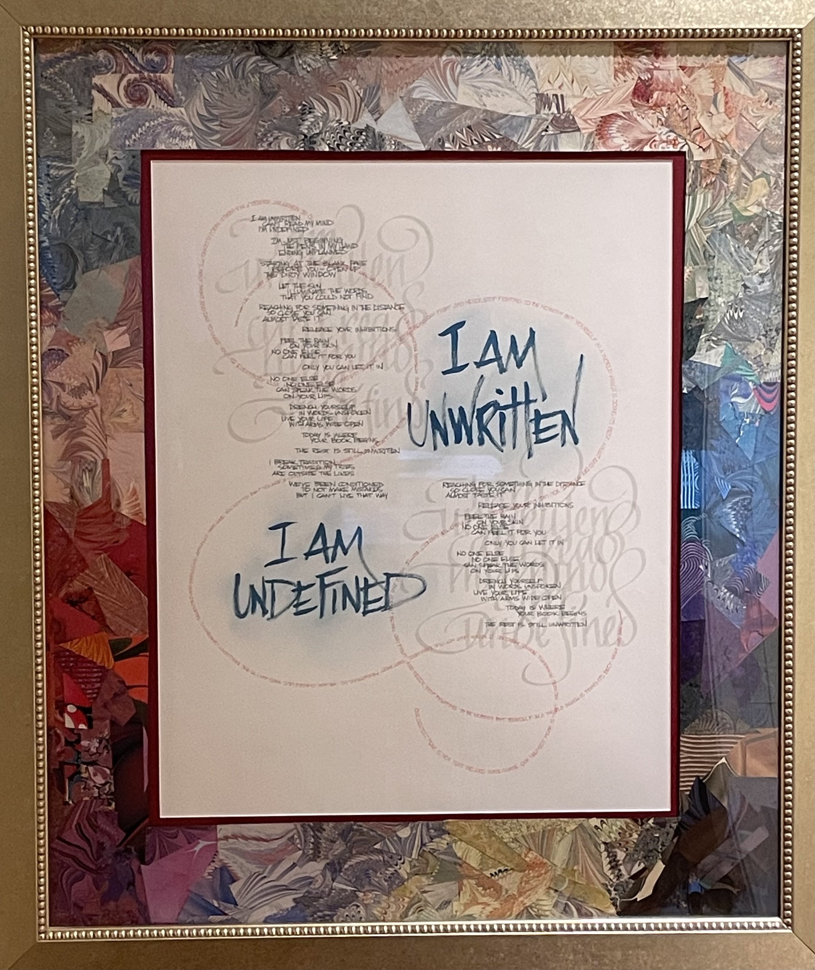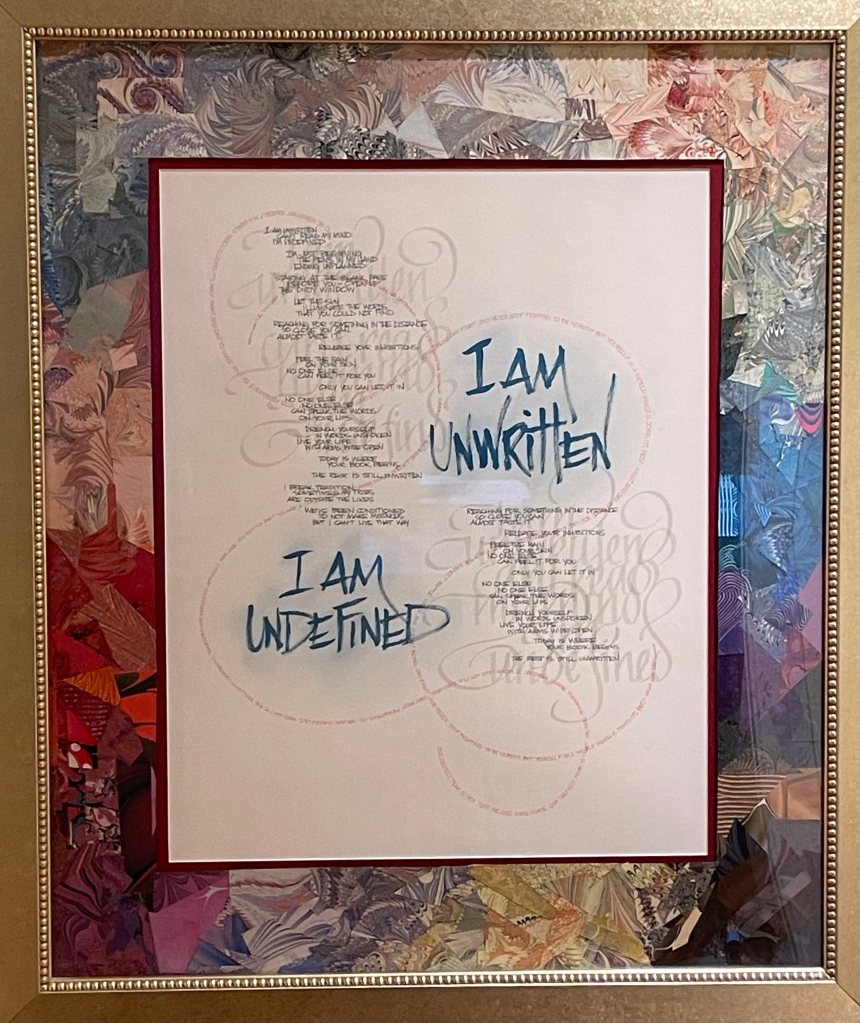 We all work hard to find our “thing”. That something we do, say, write or create that brings to life all that we have within ourselves. I have been creating with words since 1989, which is thirty-five years…more than half my life. I created this piece in portions over a ten year span. The mat came first. It was an experiment over a weekend when all my friends were out of town. I was single, bored, alone in my house and needed a distraction. I color arranged all my collected marbled paper scraps then glued them to two spare pieces of mat board. This is the larger of the two. That mat board sat in my studio (spare bedroom) for more than eight years. I did not know what to do with it…
